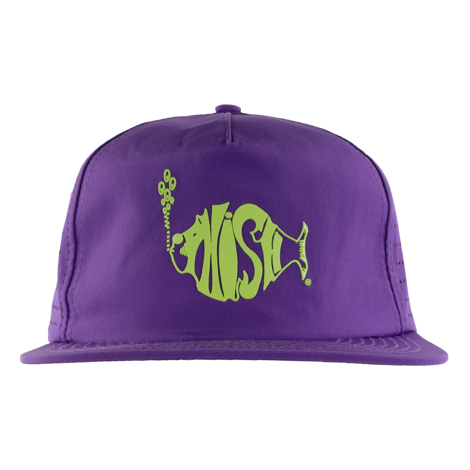 Dotted mesh-back hat, made of a quick drying nylon-blend fabric with a medium profile, bendable bill, webbing strapback and buckle closure, PVC classic Phish logo on front and custom tag on back.