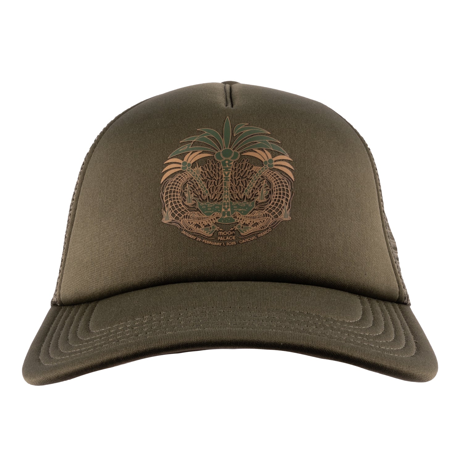 Official event hat cooler from Phish: Riviera Maya 2025. Foam front trucker with terry-lined headband, with mesh backing and snapback closure.