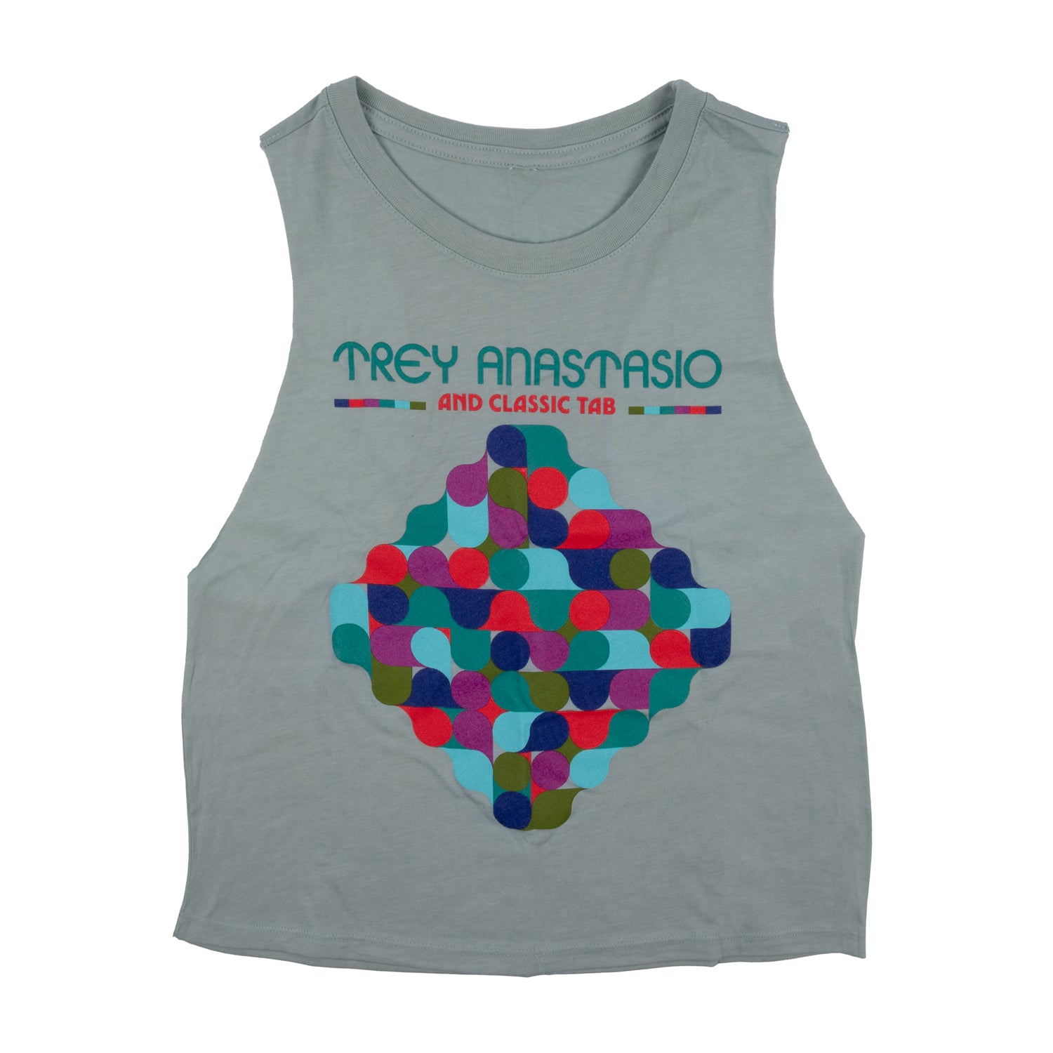 Women's heather dusty blue racerback crop tank featuring Trey Anastasio & Classic TAB artwork. First released on June 2024 Tour.