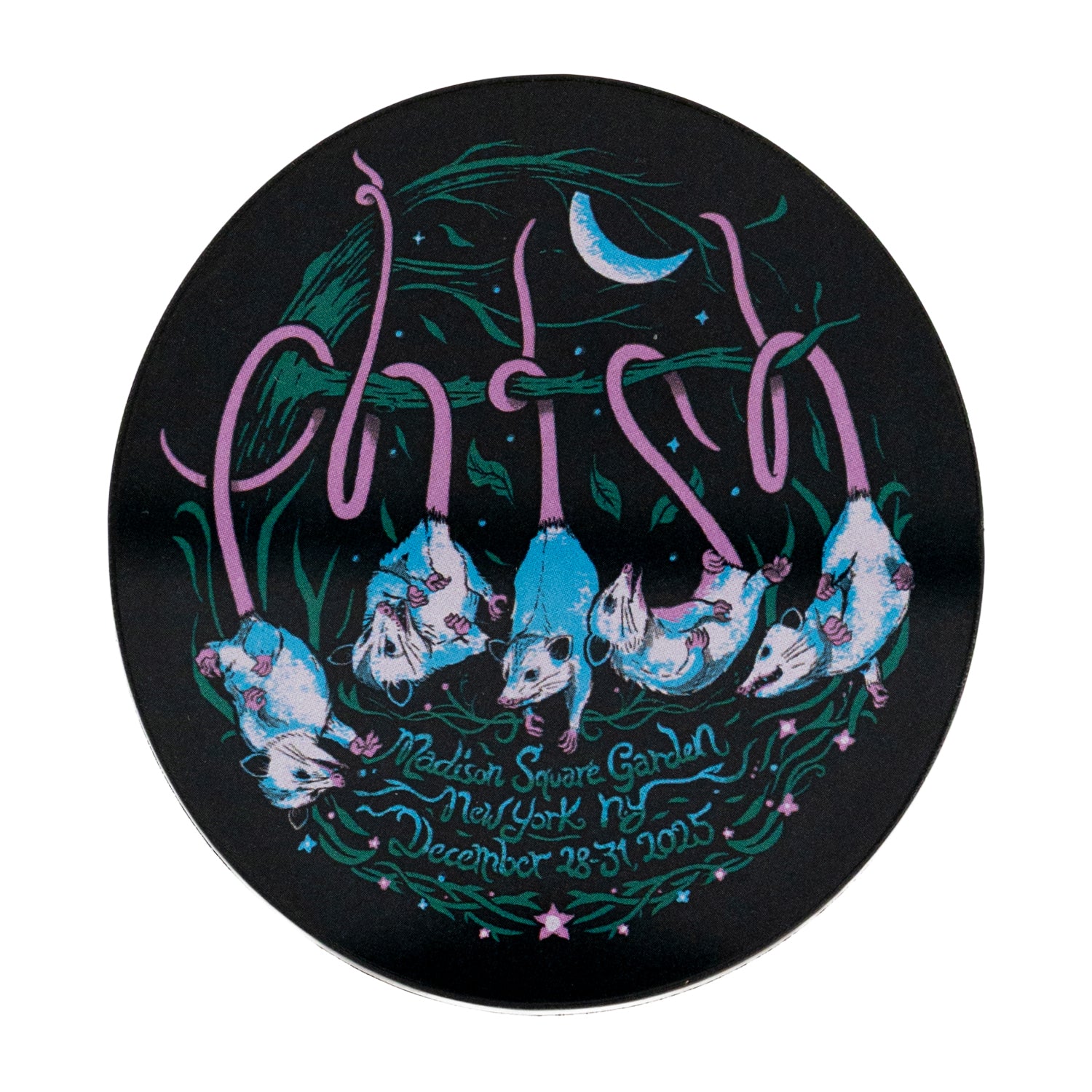 USA Made thick lucite-topped magnet featuring the Hangin Possum design from Phish's New Year's Eve Shows at Madison Square Garden, December 28 - 31, 2025.