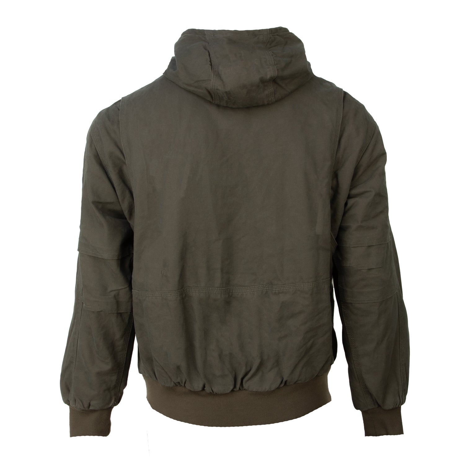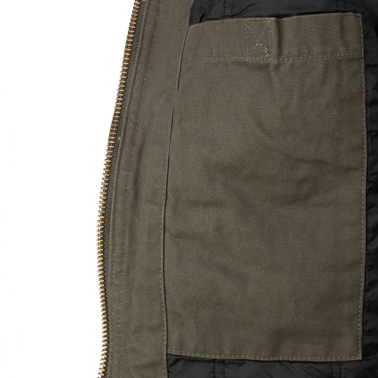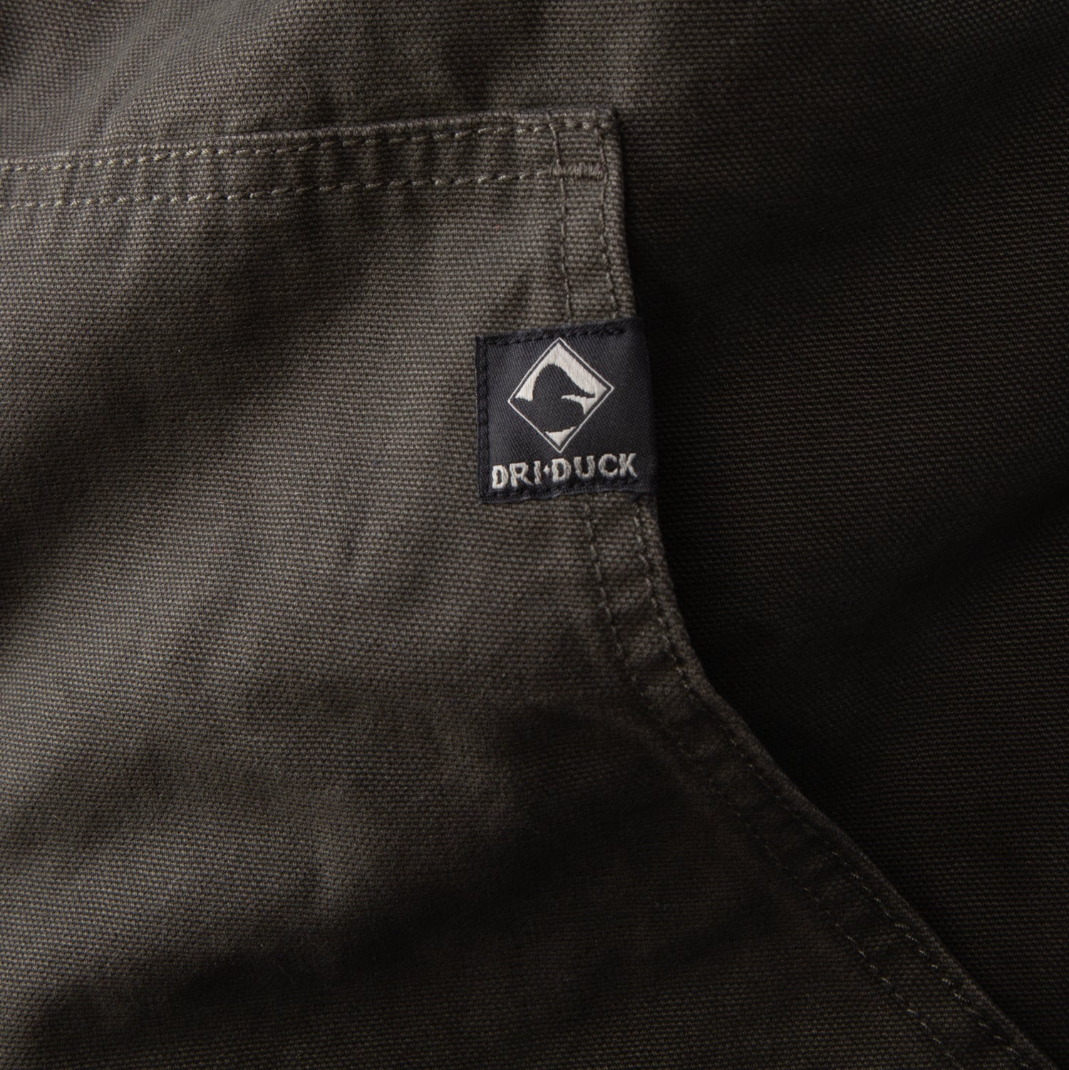 10 oz./yd, 100% cotton Canyon Cloth canvas jacket. Brushed tricot inside upper body panel. Quilted nylon inside lower body panel with 3 oz. polyfill . Flex Action back, underarm gussets, and articulated elbow. Embroidered Drop logo on chest.