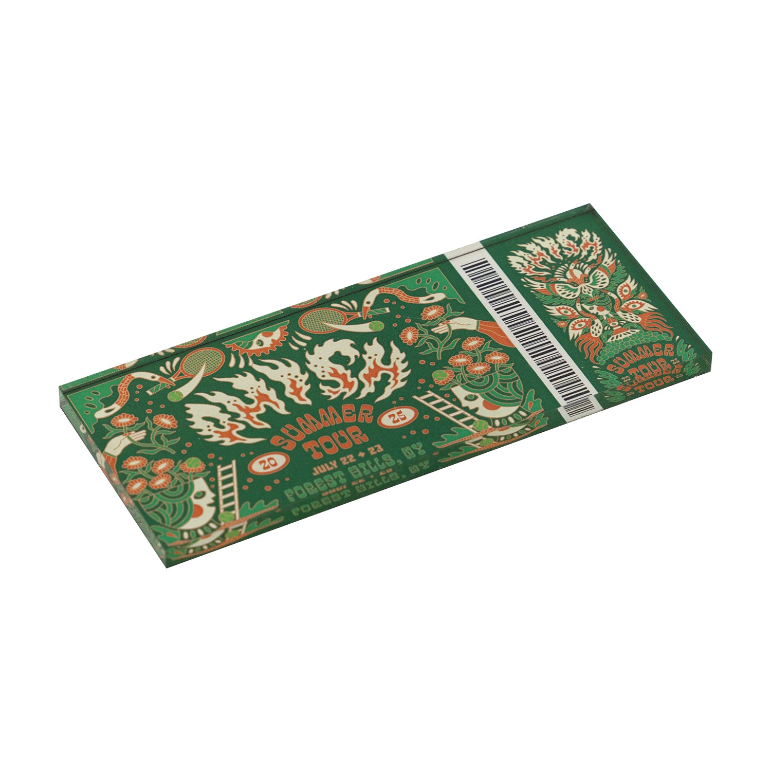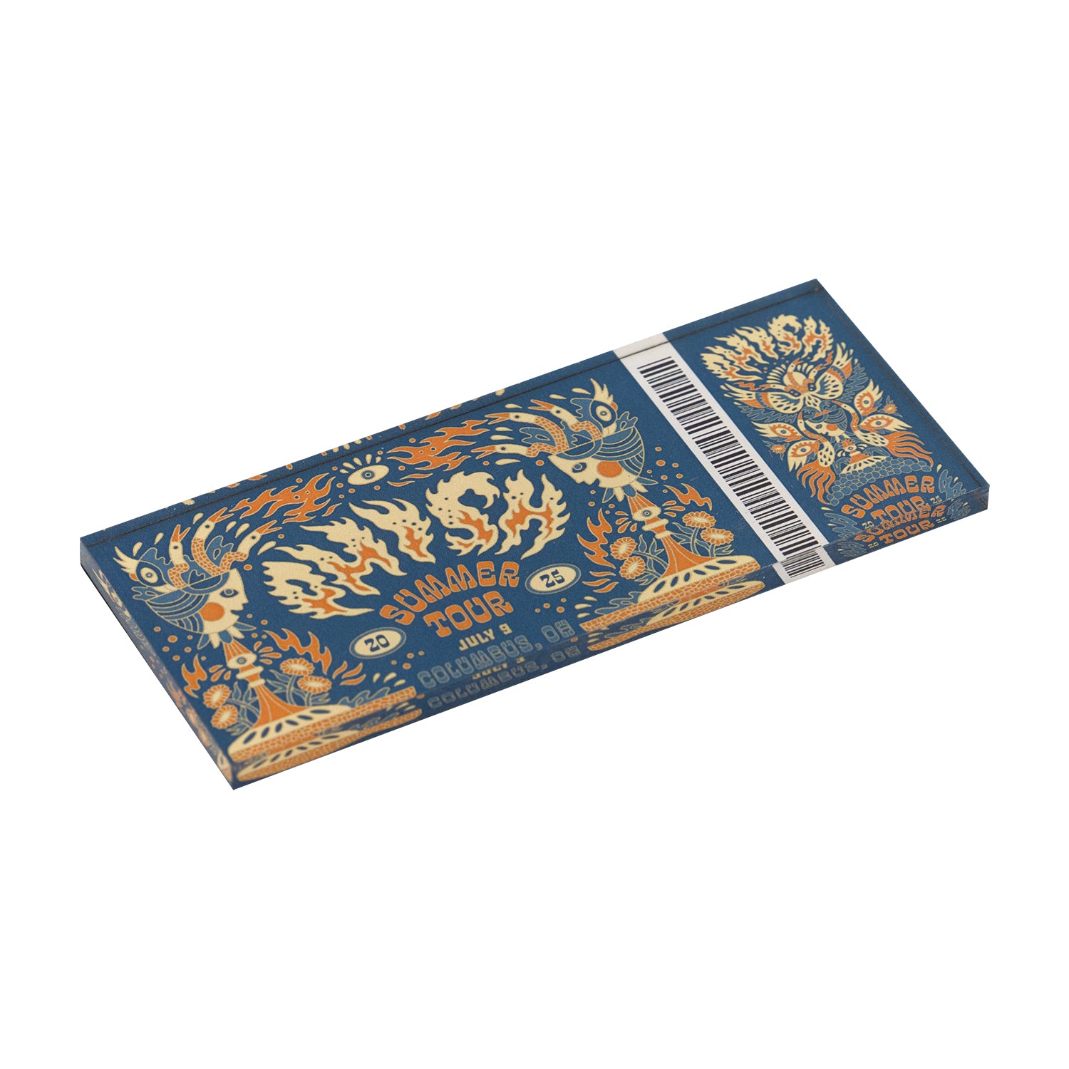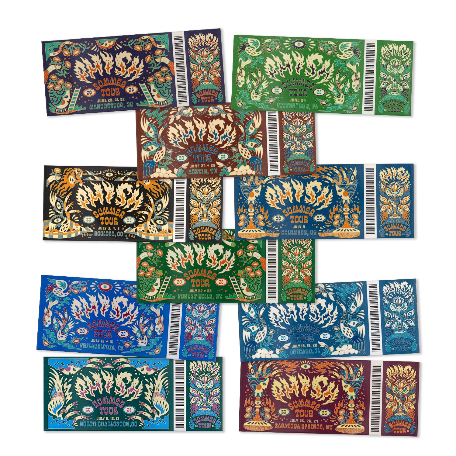 USA Made, thick, lucite-topped ticket magnets featuring art from Phish's Summer 2025 Tour.